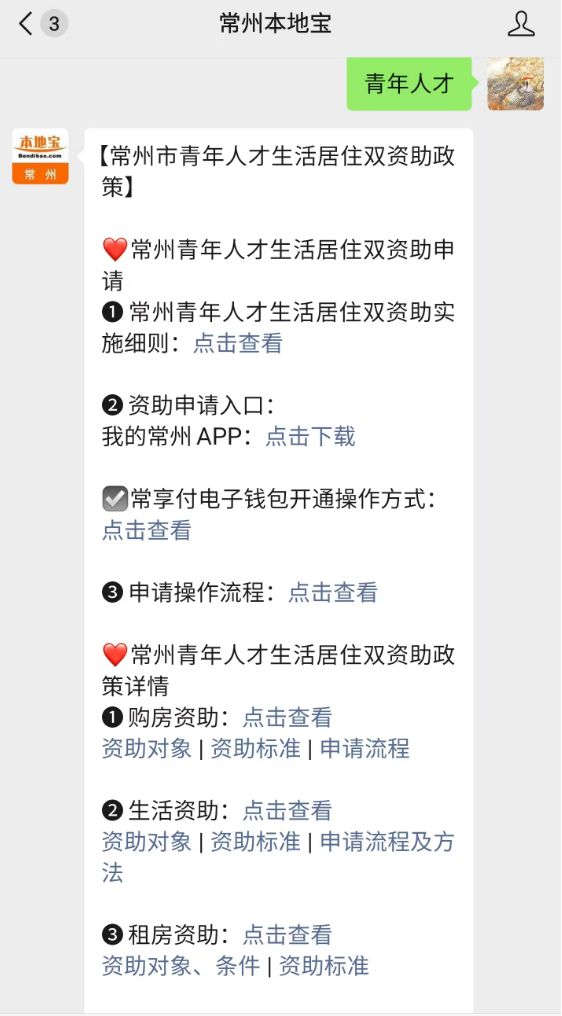 温馨提示:微信搜索【常州本地宝】公众号,关注后在对话框回复【青年人才】可获常州青年人才生活居住双资助政策详情、购房资助/生活资助/住房资助申请对象、条件、申请方式+申请入口+申请操作流程等信息。