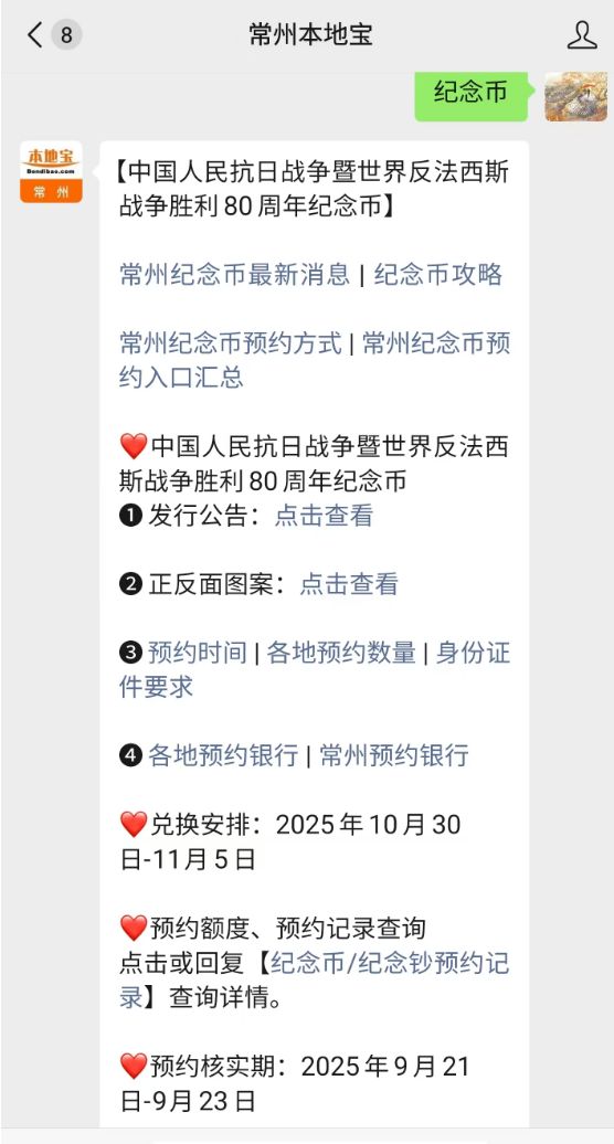 温馨提示:微信搜索【常州本地宝】公众号,关注后在对话框回复【纪念币】可获2025年抗战胜利80周年纪念币发行公告、图案、多少钱、预约时间、预约入口/数量、兑换时间/网点/数量/材料、防伪特征、金银纪念币销售渠道等信息。